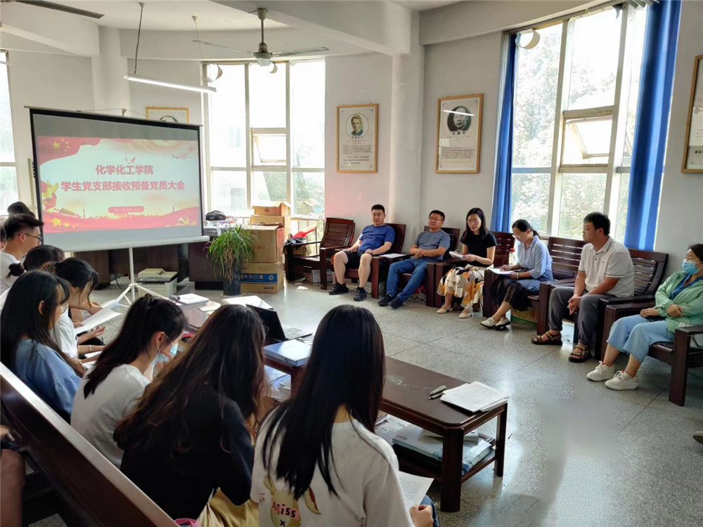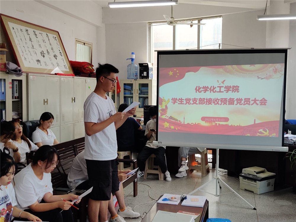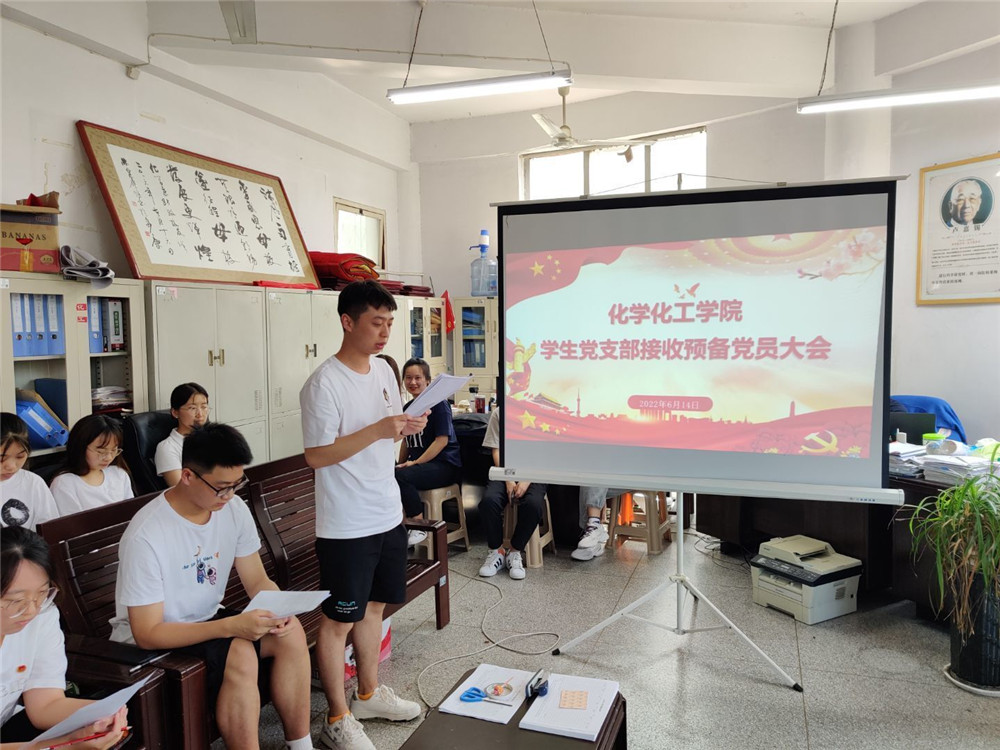 为进一步做好支部党员发展工作,为党组织注入新鲜活力,经过党支部严格考察和培养。6月14日下午,化学化工学院学生党支部在1221会议室召开预备党员接收大会,参加本次会议的有:学生党支部组织委员许珂瑶、宣传委员于正豪、8名发展对象及其入党介绍人以及全体学生党员,会议由许珂瑶主持。
