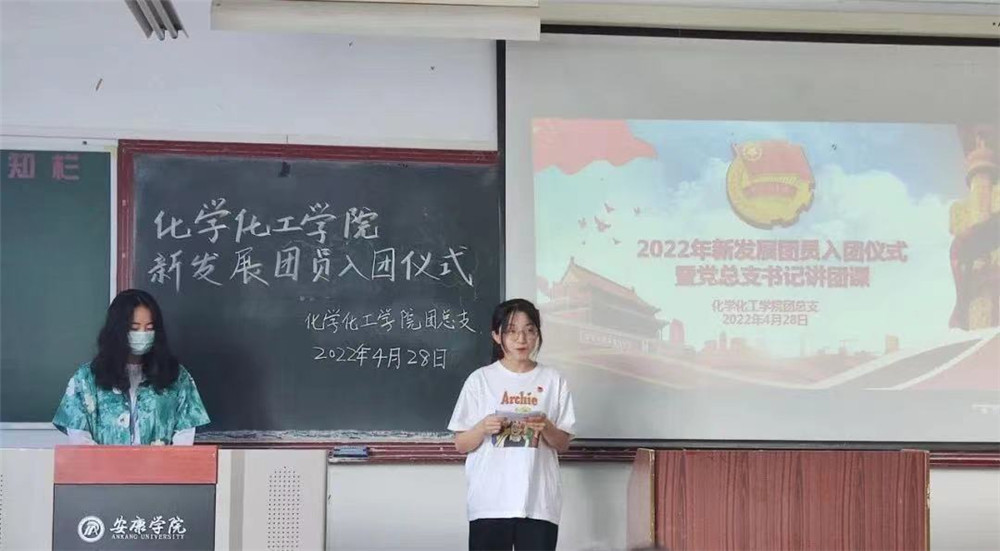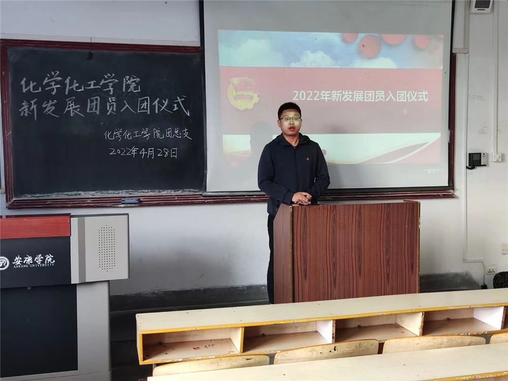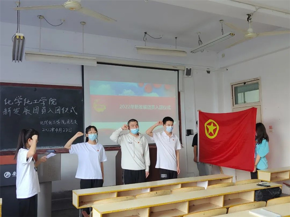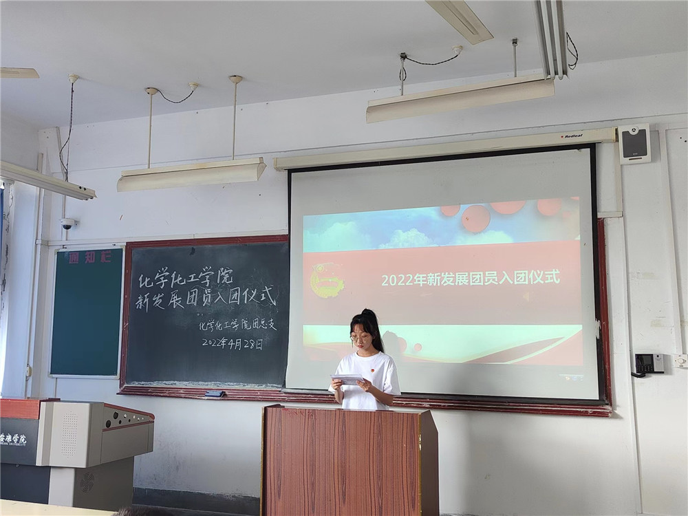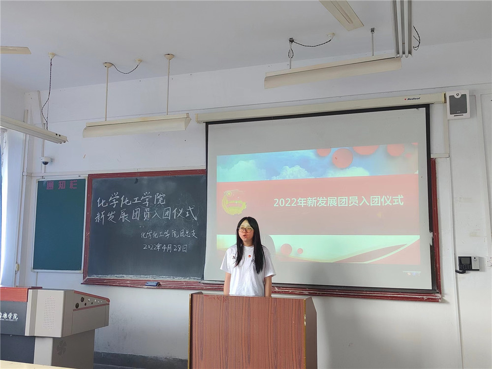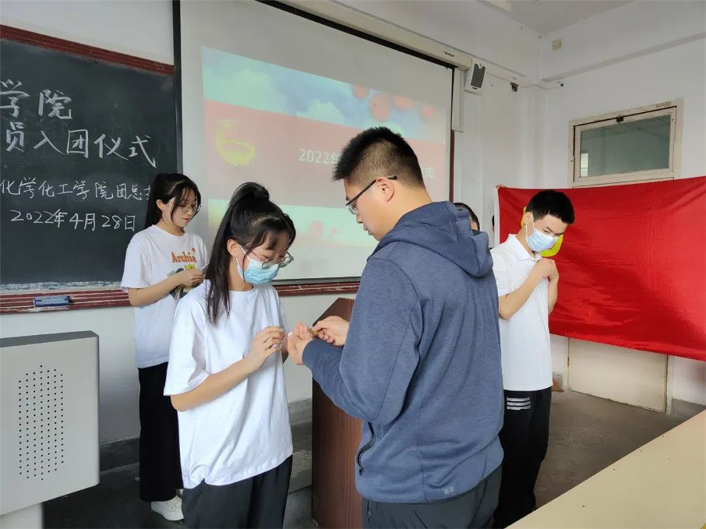 为迎接党的二十大胜利召开,庆祝中国共产主义青年团成立100周年,4月28日,化学化工学院团总支在1217室举行新发展团员入团仪式。出席本次入团仪式的有:党总支书记王永东、团总支书记成沛锐以及20、21级各支部团干部。由组织部干事郝渊婷主持。