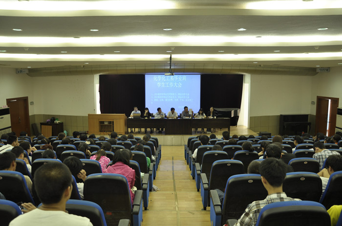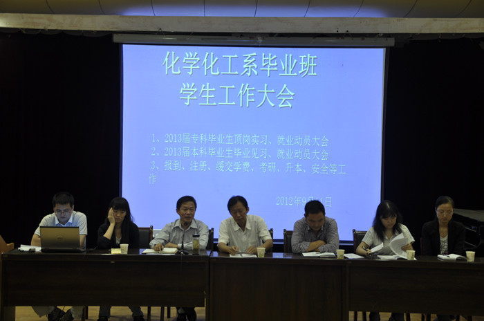 2012年9月11号下午,我系在东校区1号教学楼报告厅隆重举行了“化学化工系毕业班学生工作大会”参加大会的有化学化工系党总支书记张立虎、化学化工系主任王浩东、副主任谢娟萍、就业处郑武斌老师、毕业班代课老师、辅导员以及2013届全体毕业生约200人参加了会议,会议由学工办主任韩晔老师主持。