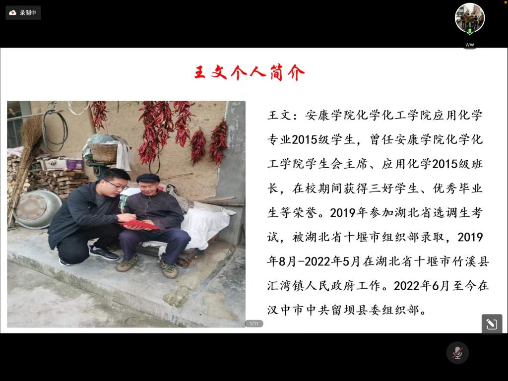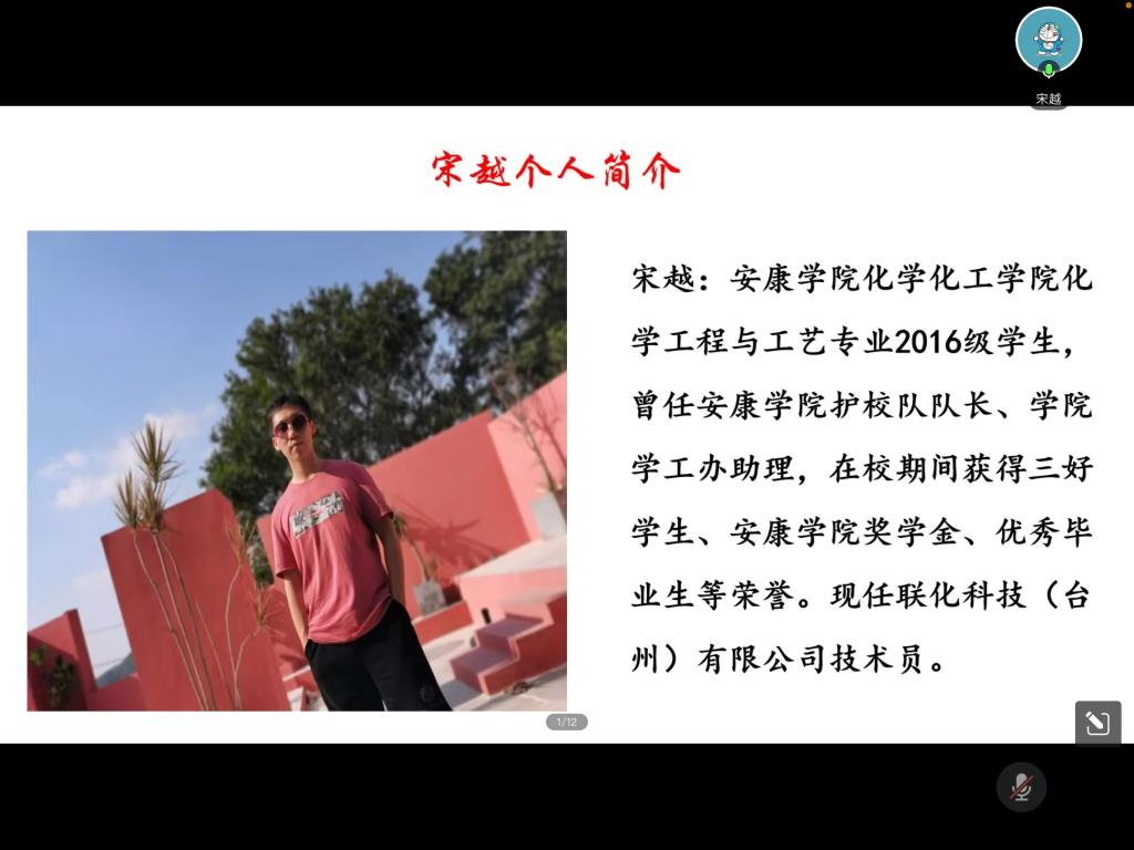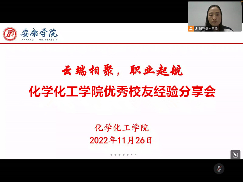2022年11月26日下午,化学化工学院举行“云端相聚,职业起航”优秀校友就业指导线上经验分享会。会议由学院学工办主任王瑜老师主持。会议诚邀优秀校友王文、宋越和穆开朗为同学们就学习、工作、考研等方面规划进行经验分享。2020级两百余名学生和辅导员许珂瑶老师参加了线上分享会。