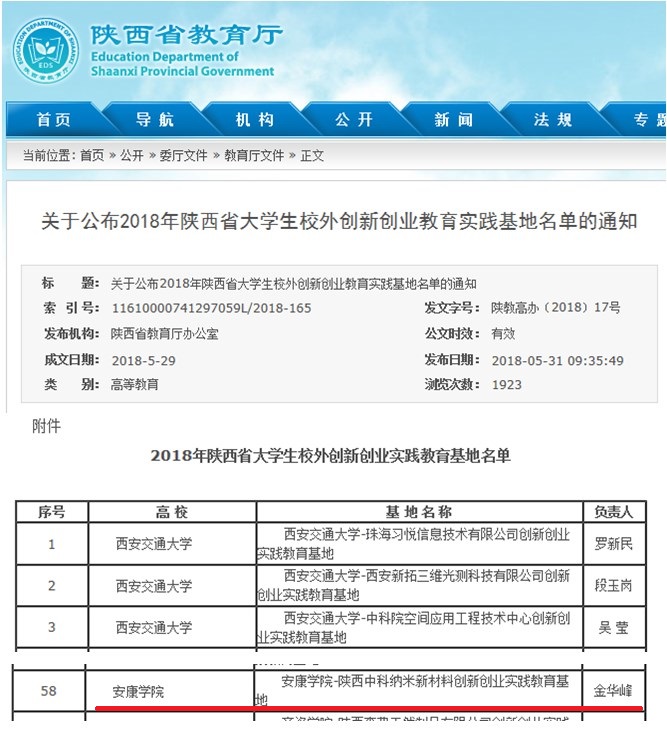 近日,陕西省教育厅公布了2018年陕西省大学生校外创新创业教育实践基地名单,我校化学化工学院申报的“金沙集团wwW3354CC-陕西中科纳米新材料创新创业实践教育基地”获批建设立项。