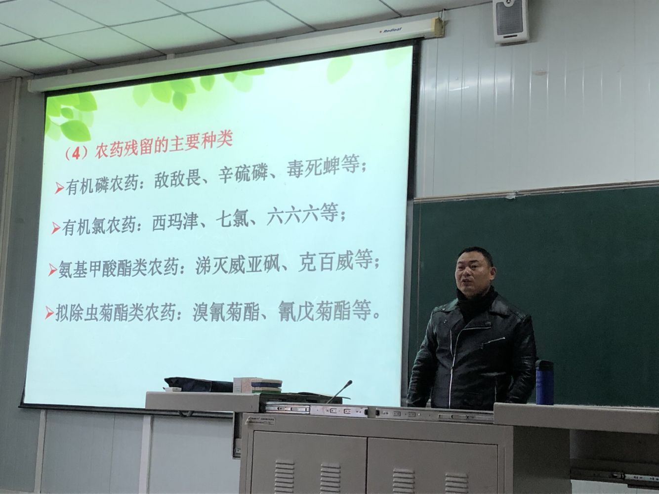 11月16日,安康市农产品质量安全检验检测中心柯培新农艺师为2017级应用化学专业,制药工程专业学生开展《行业案例》授课。柯培新农艺师以农产品质量安全检测为例,从农产品质量安全的涵义;农产品质量安全管理的内容;农药残留的定义,危害及种类;快速检测与实验室定量检测的方法及优缺点比较;农药残留的检测方法与技术;农业生产环境检测六个方面为学生介绍了农产品检验检测的基本知识,使学生了解了目前农产品质量安全危害主要因素,我国农产品质量安全管理的方法,以及目前农药残留检验检测现状与发展和农药残留检验检测主要方法等内容。