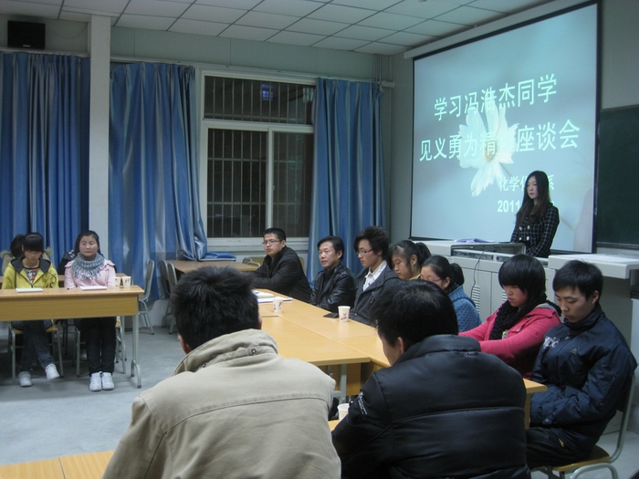 2011年12月13日晚7:00,我系在1018教室召开“学习冯浩杰同学见义勇为精神”座谈会,出席本次座谈会的有化学化工系党总支书记张立虎老师,学工办主任韩晔老师,辅导员张建东老师,以及农生院学生代表,我系学生会成员、学生代表100余人。