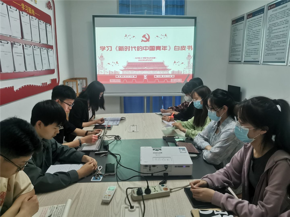 2022年4月29日下午三点,化工学院学生党支部学生党员在组织委员许珂瑶的带领下组织开展《新时代的中国青年》白皮书学习会,会上同学们认真讨论白皮书有关内容,并纷纷表达了自己的感想。