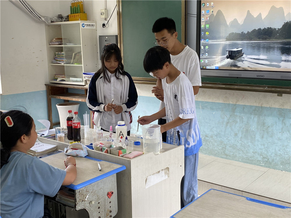 本次汉滨区县河镇财梁九年制学校的科普活动,覆盖了小学及初中部的学生。力图寓教于乐,将在课堂中所学的知识融入教学内容之中,课堂上,老师和科普团成员们共同带领同学们体验了“无中生有”、“魔法药水”、“牛奶可乐”等多个趣味化学实验,同学们的目光都被神奇的实验所吸引,在欢声笑语中向同学们展示了化学之美。科普团成员在展示实验现象的同时,也不忘深入浅出地为同学们讲解其中的化学原理。在掌握了化学基本原理后,老师和科普团成员对同学们动手实践进行了指导,他们用童真的双眼和稚嫩的手完成了一次次实验,在实验过程中,很多学生第一次触碰烧杯、试剂,即使其中遇到了不少小问题,在科普团成员的帮助之下也都迎刃而解,完成了自己的小实验。