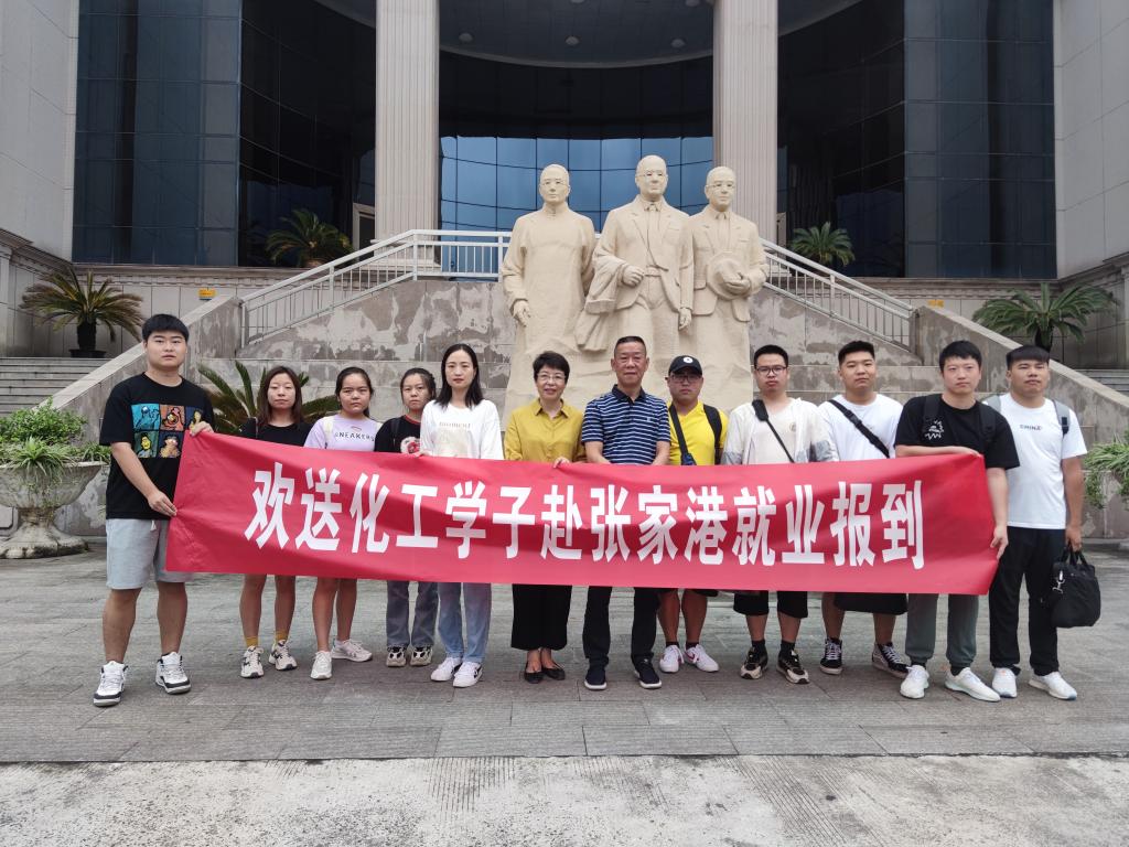 2022年7月6日,金沙集团wwW3354CC2022届13名毕业生离校前往江苏省张家港市江苏七洲绿色化工股份有限公司就业报到。化学化工学院院长柳林、党总支书记王永东、毕业班辅导员王瑜、于正豪在校门口欢送毕业生并合影留念。