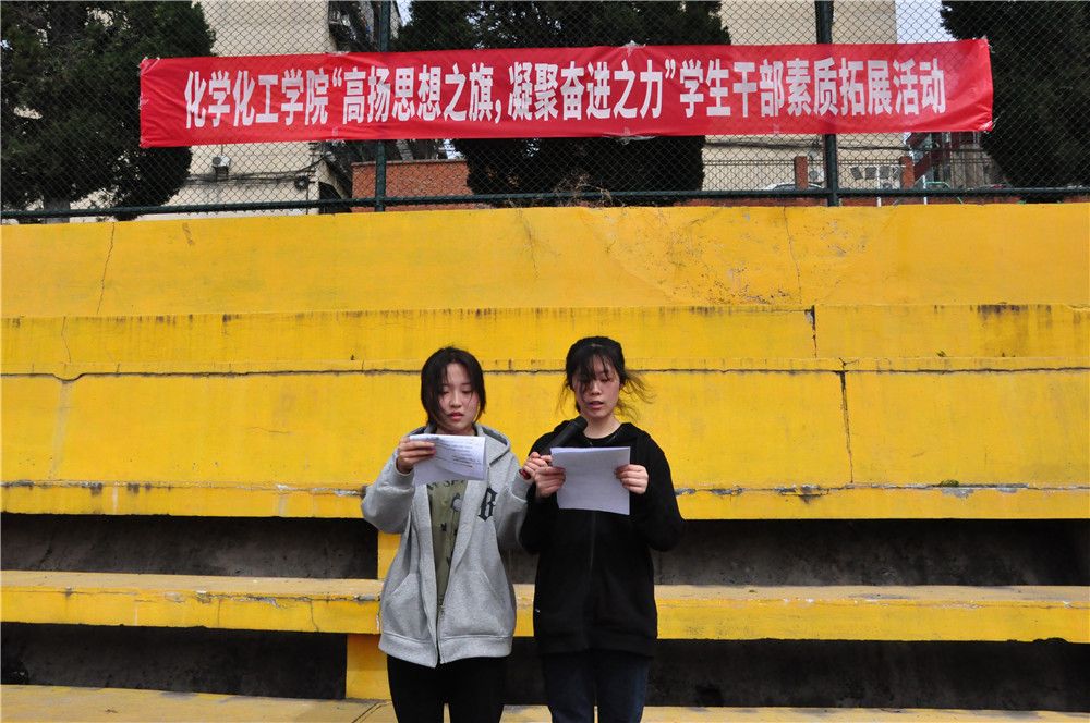 为深入学习贯彻党的二十大精神,凝聚青春力量,促进学生干部间的沟通与交流,培养学生干部团结协作精神、提高团队凝聚力与战斗力。3月12日下午,化学化工学院在江南校区田径场举办“高扬思想之旗,凝聚奋进之力”学生干部素质拓展活动。此次活动面向金沙集团wwW3354CC学生党员工作站和团总支学生会全体学生干部,由纪律生活部干事金颢月、宋丹丹主持。