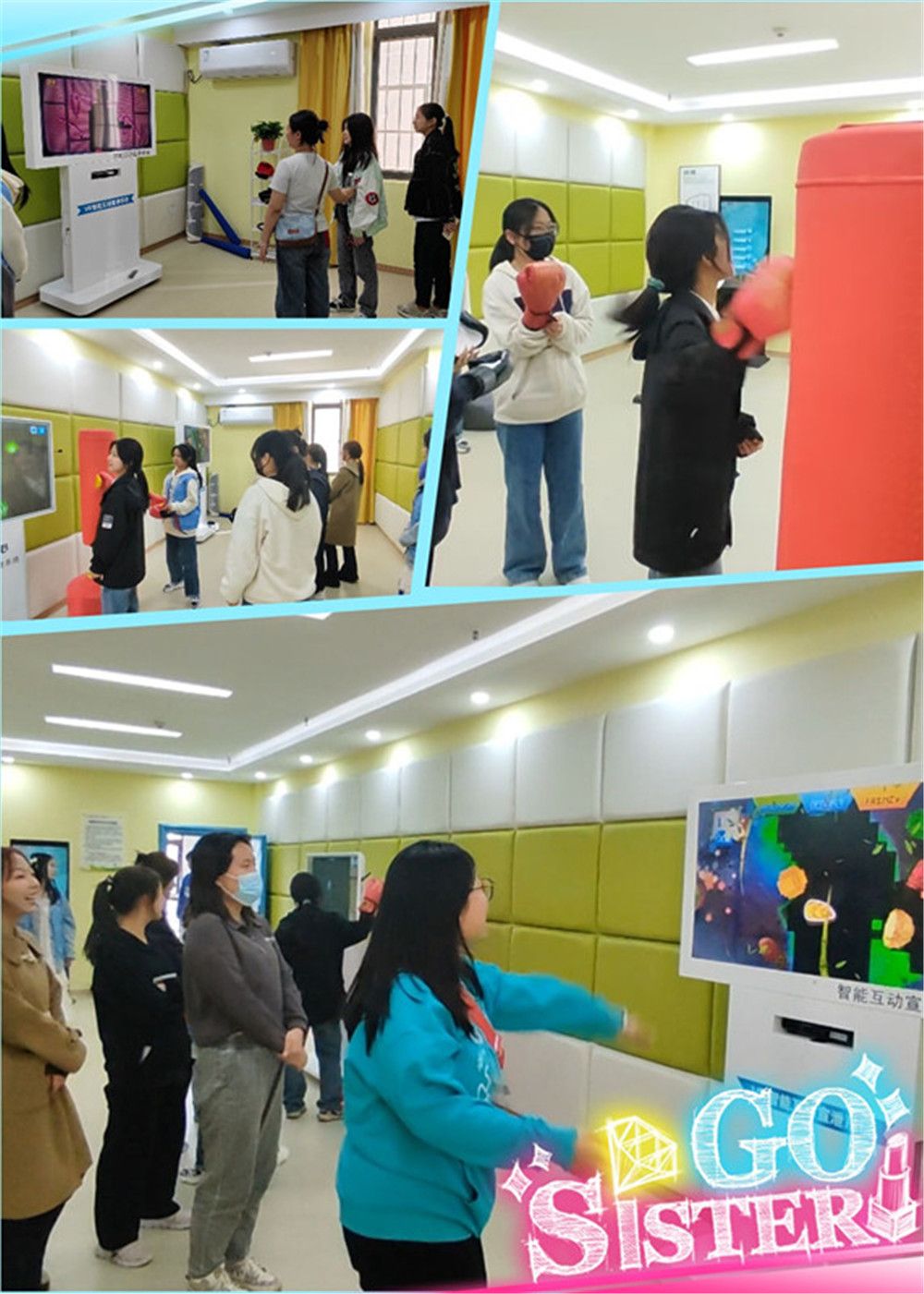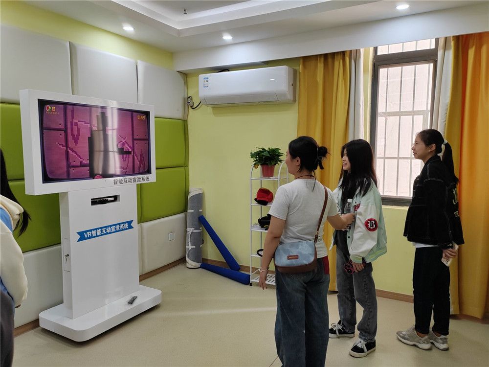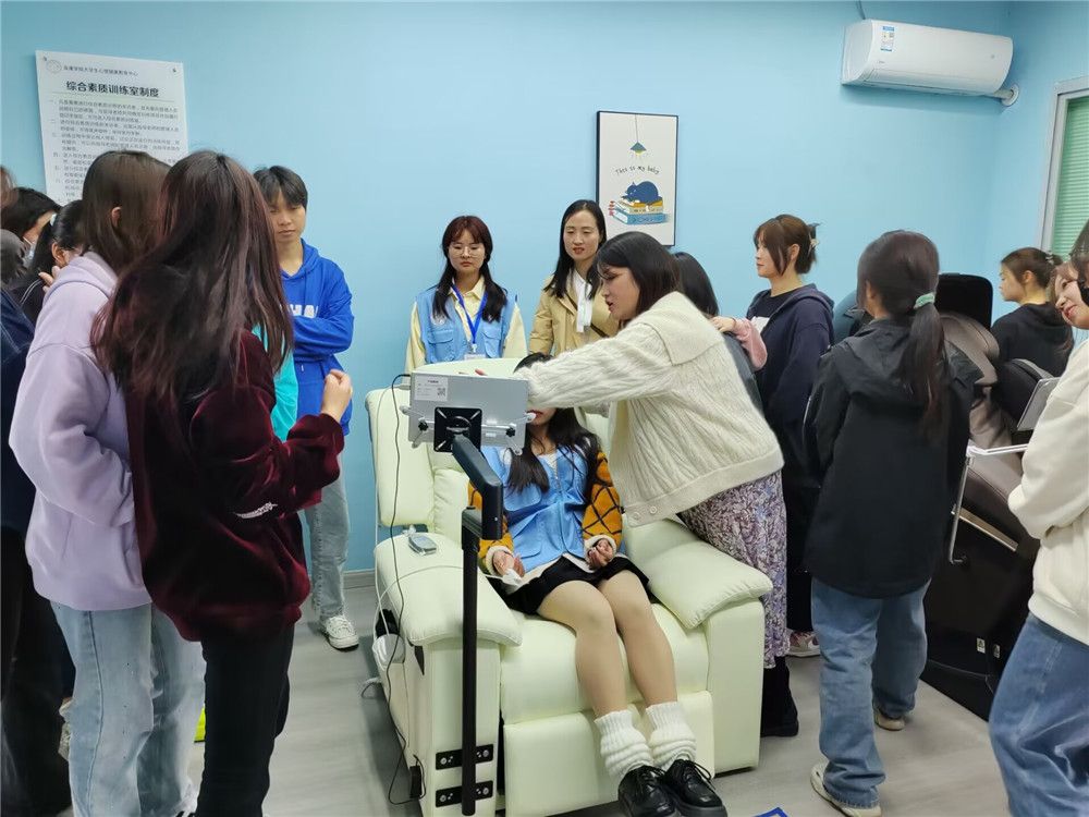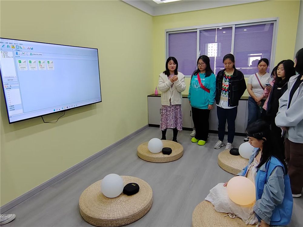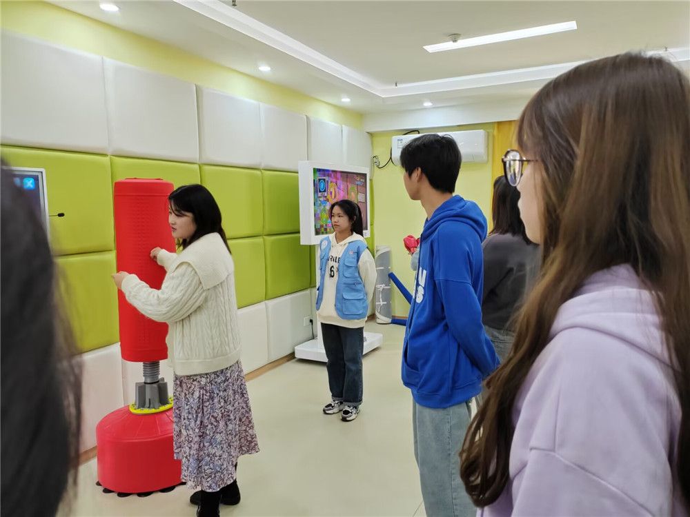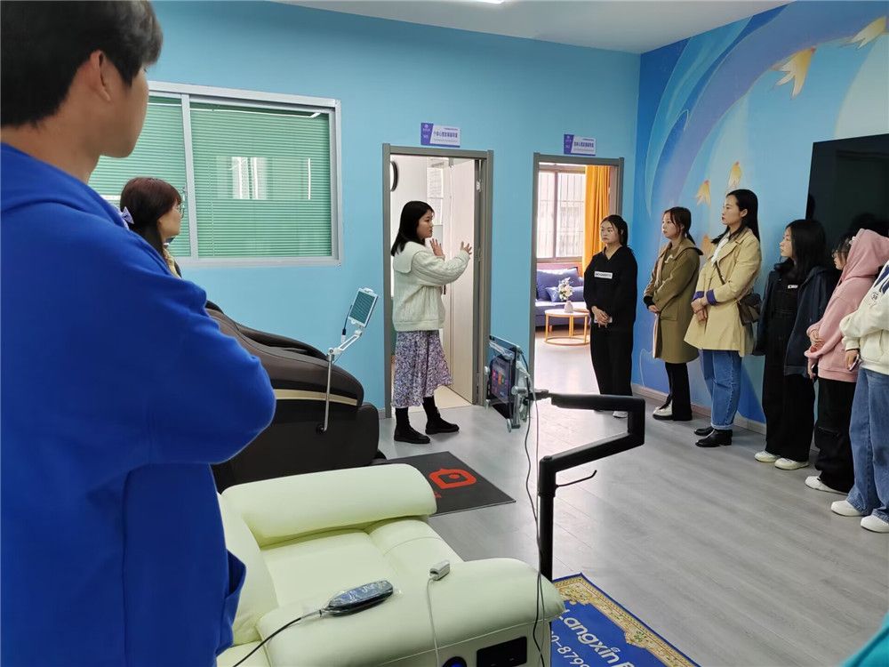 我校心理健康教育中心主任柯小敏老师向同学们介绍了大学生心理健康教育中心的职能、专兼职心理咨询师、基本建设等情况,带领同学们依次参观了来访接待室、朋辈心理工作站、情绪宣泄室、综合素质训练室、积极心理学体验中心,详细讲解了各功能室的主要用途及使用方法。同学们尝试了击打情绪宣泄装置,躺在沙发上听音乐放松身心,真正体会到了调节情绪、释放压力的效果,对心理健康中心的工作有了更直观、更深入的认识。