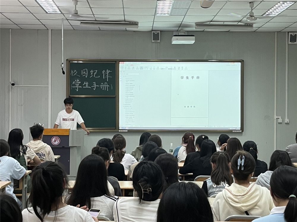 班会上,辅导员于正豪老师和各班班助重点解读了学生管考试作弊、违纪违规处理、学籍管理、课程考核及学士学位授予、评奖评优、家庭经济困难认定、德育考评和学生住宿等方面的内容,为同学们解答疑惑点和重要关注点,在师生互动中交流答疑,在答疑解惑中进一步明晰学校的规章制度和相关要求。