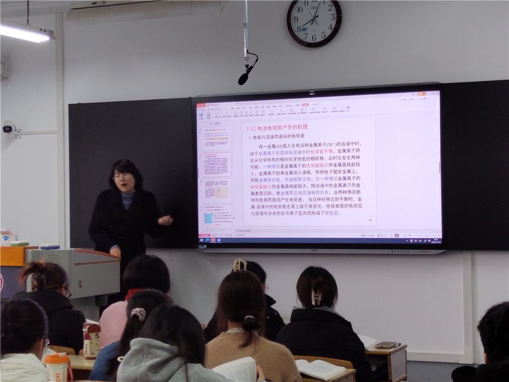 王晓林老师讲授的内容是“电化学-可逆电池概论”,在可逆电池的基础上引入三类可逆电极,生动形象地讲解了三类可逆电极对应的电极反应以及使用的条件、电池表示与电池反应对应关系、可逆电池的热力学等,在每个知识点后设置随堂小测,实时检查学生对知识的理解和掌握,引导学生进行知识点的总结归纳,为大家呈现了一堂精彩的教学观摩课。