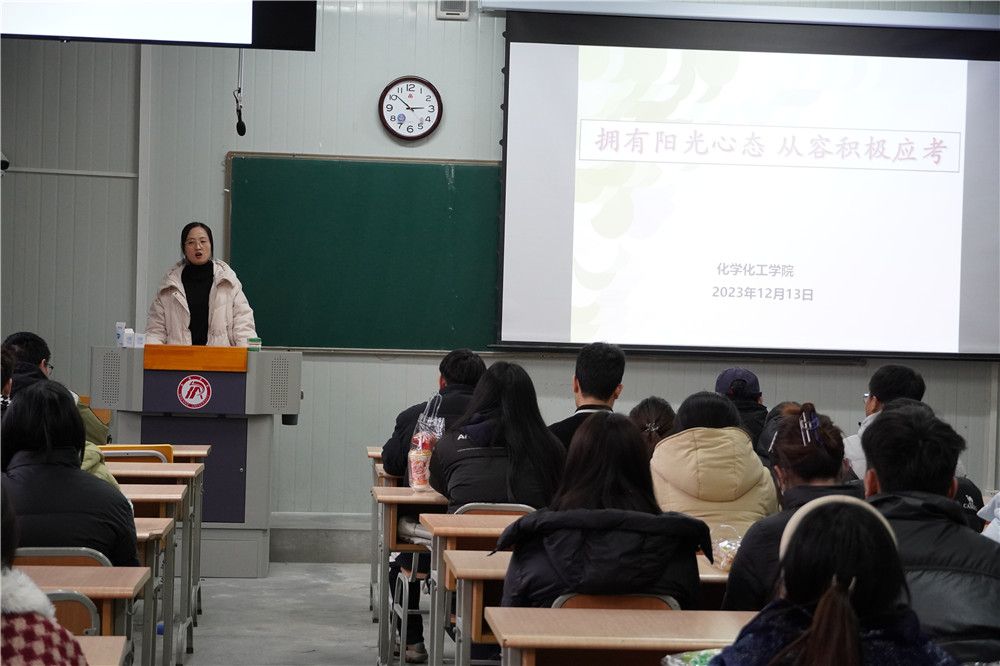 为进一步引导和帮助2024届考生缓解备考焦虑情绪,正确认识并调适考研前的心理压力,培养稳定积极的备考心态,化学化工学院于12月13日开展考研学子考前心理调适座谈会。化学化工学院院长柳林、辅导员王瑜和许珂瑶出席本次会议,108名2024届考研学生参加会议。会议由毕业班辅导员许珂瑶主持。