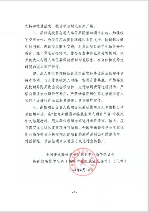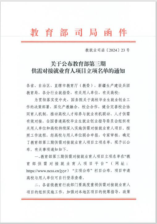 近日,教育部印发《关于公布教育部第三期供需对接就业育人项目立项名单的通知》(教就业司函〔2024〕23号),文件公布了教育部第三期供需对接就业育人项目立项名单,金沙集团wwW3354CC共有3个项目获批立项。