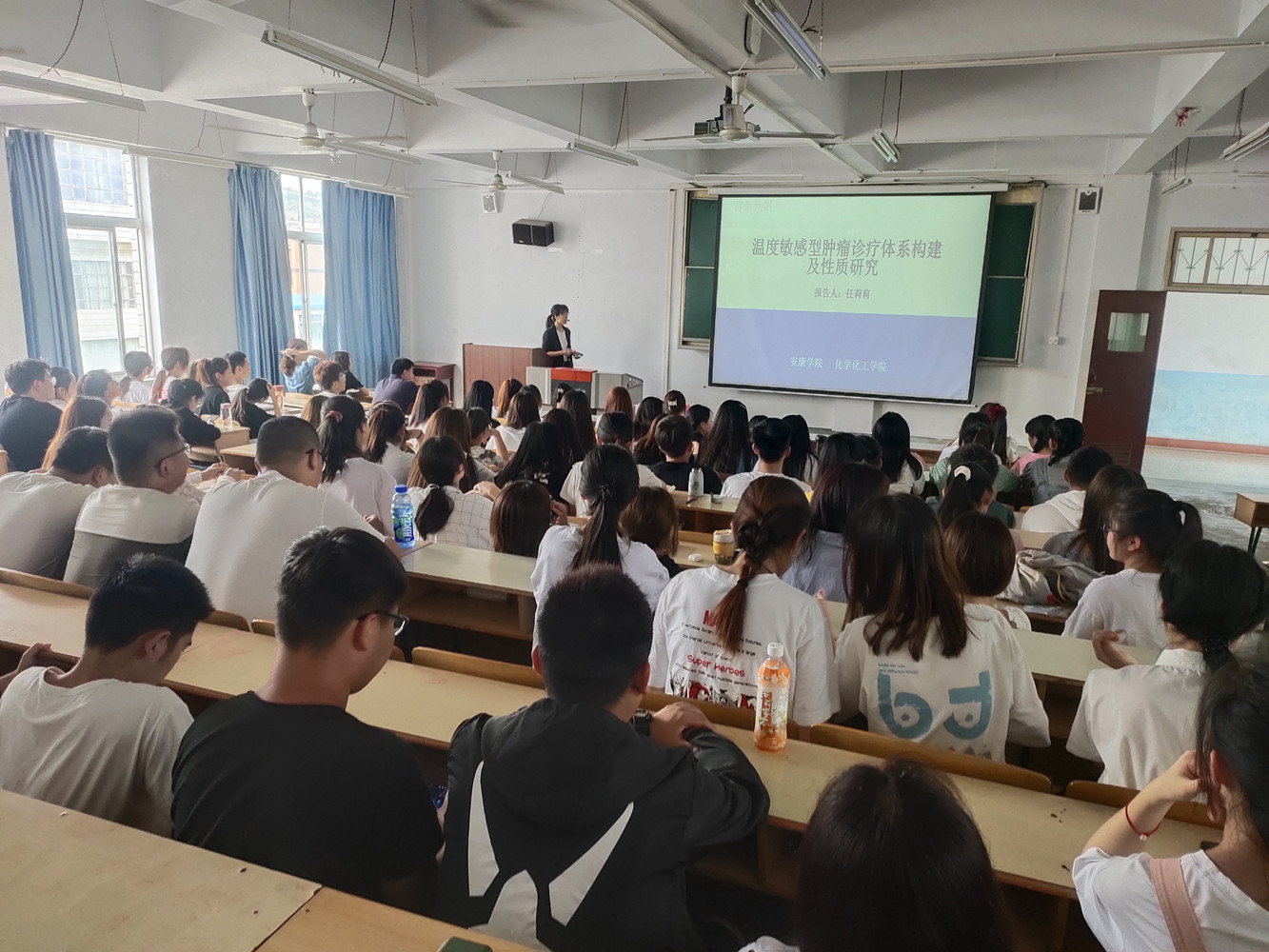 在讲座中,任莉莉博士详细介绍了当今全球癌症种类变化情况、发病主要原因、检测治疗方法及温度敏感型诊疗试剂的设计、合成、性质研究等内容。并在最后介绍了秦巴中药资源研究平台,鼓励同学们积极加入科研队伍,提高各方面能力。